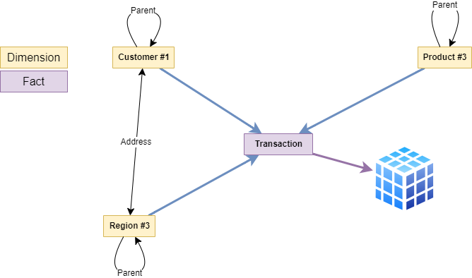 For example, a Cube of Transactions with dimensions {Customer, Product, Region}, the addition of Fact Nodes creates transitive edges for {Customer->Product, Customer->Region, Product->Region} via transaction fact. When combined with Transitive Edges (Hyper Edges) it becomes possible to view to Cube data through a graph view in a Hypergraph.