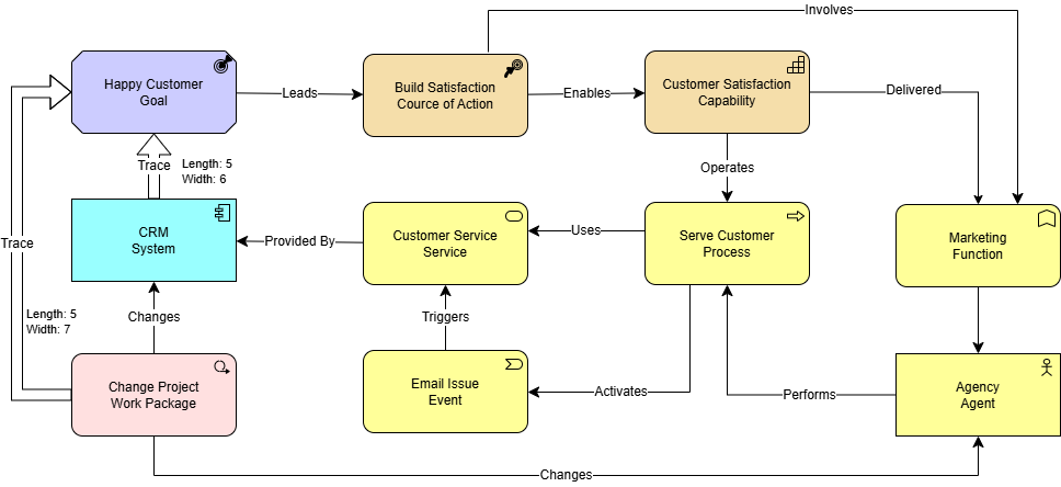 The broad arrow Trace highlights the derivied HiperEdge that we're looking to understand linking the CRM system and Change Project to the goal Happy Customer. From the paths we can see that